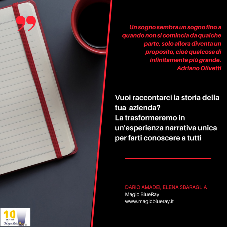 Ognuno di noi ha la possibilità, con la narrazione, di esternare il suo mondo trasmettendo il suo vissuto, le sue emozioni e rendendo concrete, nella parola scritta, quelle situazioni importanti della sua vita professionale e personale, destinate altrimenti all’oblio. La tua STORIA è importante anche per farti conoscere, per far conoscere ciò che ha guidato ed animato la tua visione aziendale o la tua idea di un'impresa appena nata.